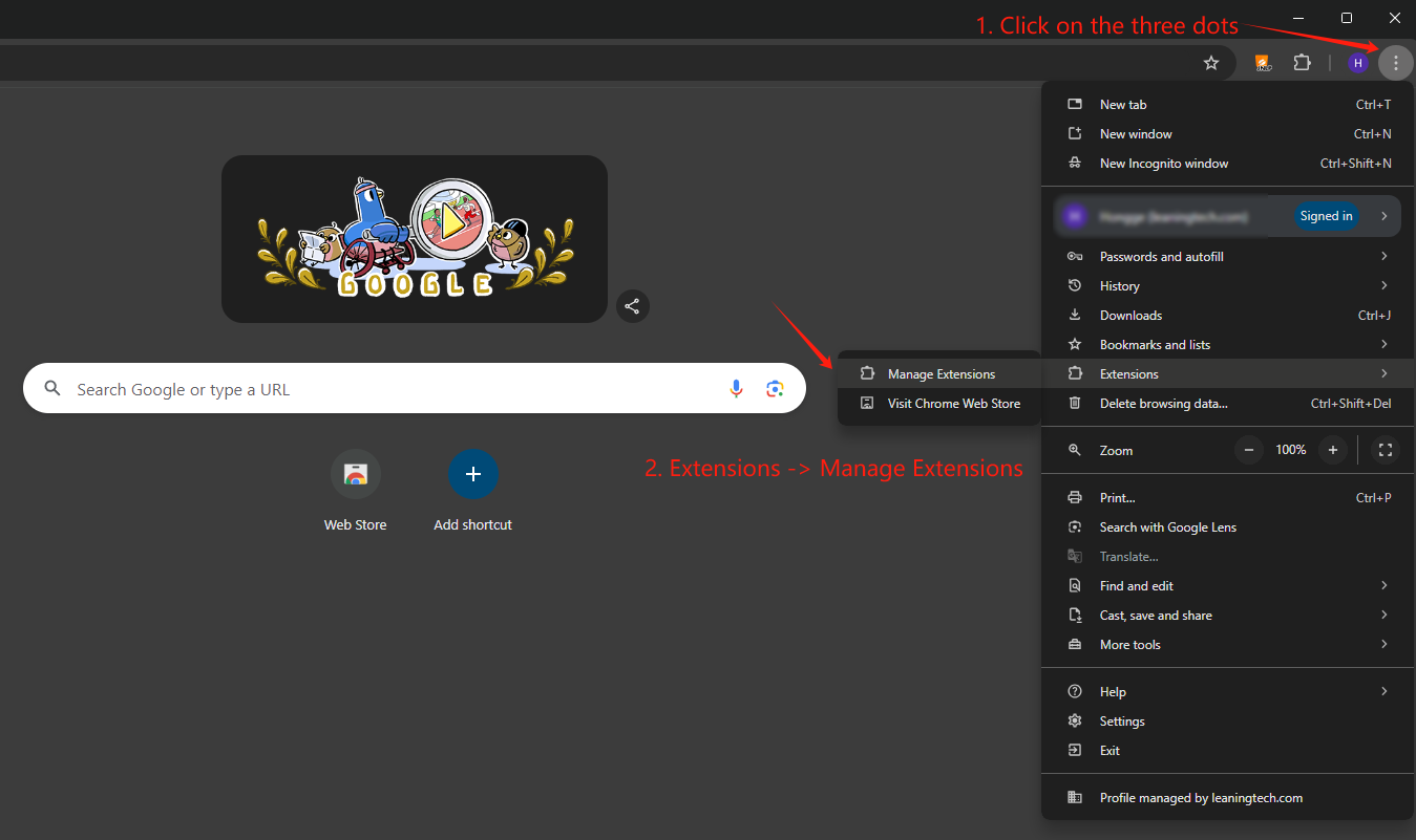 Let us access the Chrome extensions settings by clicking the three dots in the upper-right corner of the Chrome browser, going to Extensions and then selecting Manage Extensions.