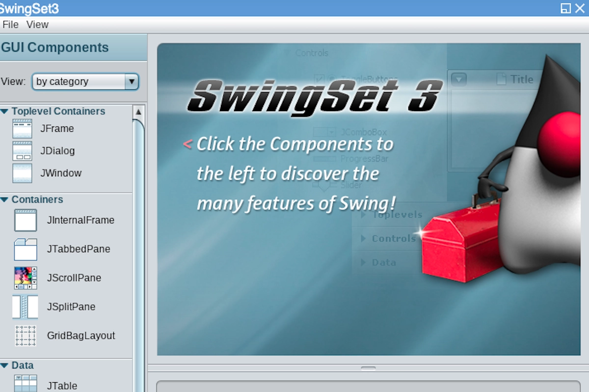 SwingSet3 is an open source demo of Java components from the Swing Graphical User Interface (GUI) Toolkit. It was originally created by Oracle/Sun Microsystems and is currently being developed as a public java.net project by SwingLabs.